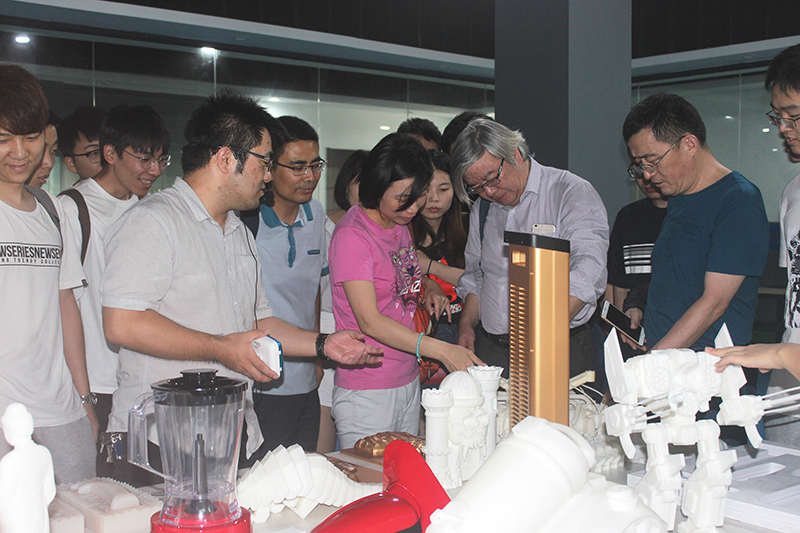 在樣品間,琳瑯滿目的展品引起了浙大師生強烈興趣和反響。陶總結合3D打印模型向浙大師生一行介紹了3D打印的成型方式及各種材料。3D打印車間內工作中的3D打印設備則讓浙大師生一行更直觀的了解了3D打印的成型原理。