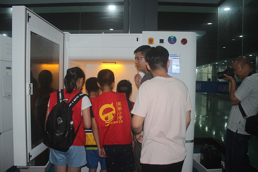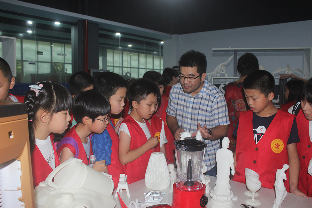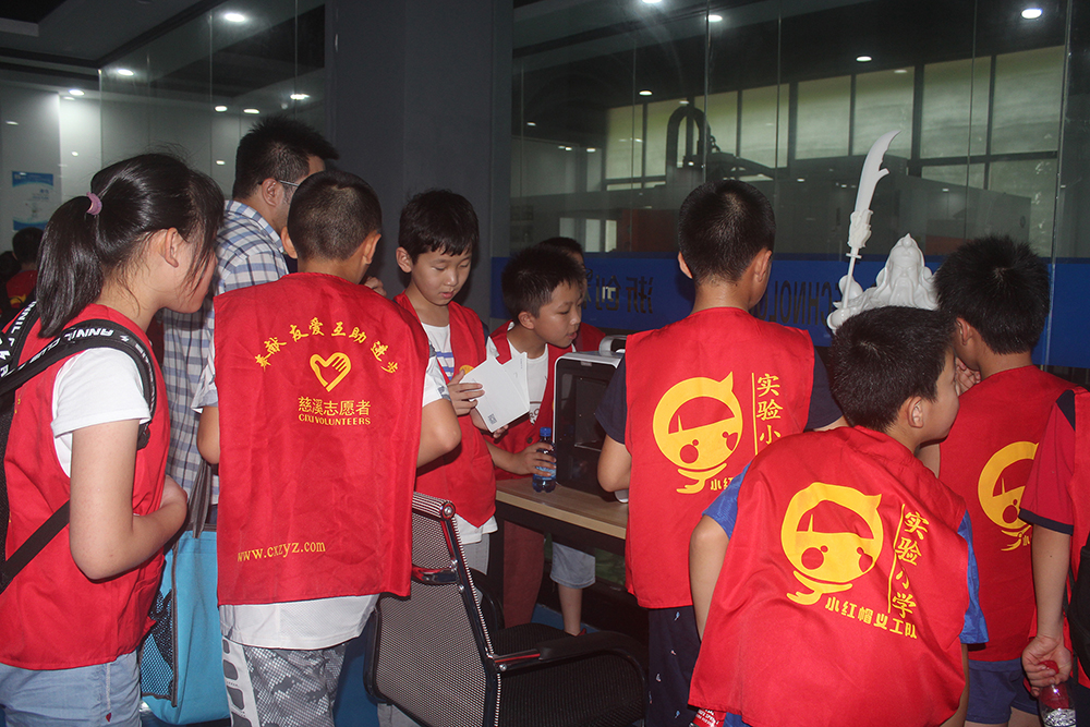 接著,在浙創科技工作人員以及家長的帶領下,同學們又分批來到3D打印車間。工作中的3D打印機引起了在場同學的好奇,工作人員向同學們生動簡單的介紹了3D打印的流程,在說道:“只要把模型文件輸入進去打印機,什么復雜的東西都可以打印出來的”時候,同學們發出了陣陣驚嘆。